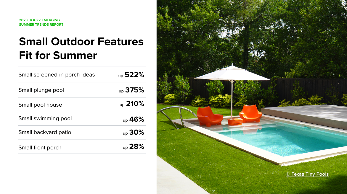 Homeowners aren’t letting space limitations keep them from enjoying their outdoor areas this summer. Searches for “small swimming pool” grew by half, compared with the same period in 2022. In fact searches for “small plunge pool” and “small pool house” jumped nearly 4x and 3x, respectively. Interest in “small outdoor kitchens” also more than doubled. People in mosquito prone areas may be looking for ways to enjoy the outdoors from the safety of their porch, with searches for “small screened-in porch ideas” growing 6x, compared with the previous year.