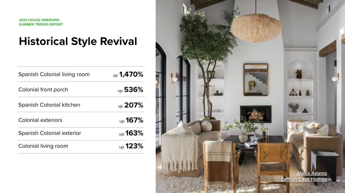 We’re seeing growing interest in classical architectural and design features with two styles standing out in emerging search trends: Colonial and Spanish Colonial. Searches for Colonial-associated “front porch,” “exteriors” and “living room” all increased by 6x, 2.5x and 2x, respectively, compared with the same period in 2022. Searches for “Spanish Colonial living room” jumped significantly by 15x. “Spanish Colonial kitchens” and “Spanish Colonial exteriors” tripled and more than doubled, respectively. Whatever the style, homeowners are hiring architects and designers on Houzz to help them honor the roots of their homes, while updating them with a cohesive, intentional look.