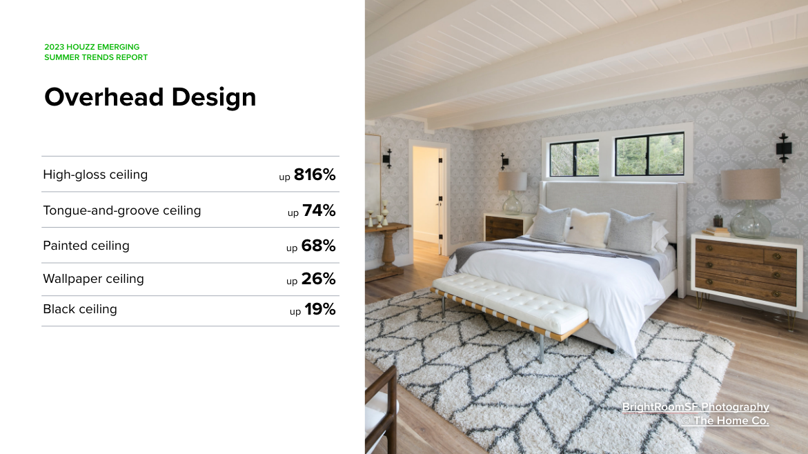 The fifth wall, or ceiling, has historically been an overlooked surface, but design enthusiasts on Houzz are calling attention to it with paint and texture. Searches for “high-gloss ceiling,” “painted ceiling” and “black ceiling” have all increased compared with the same period in 2022, and interest in “tongue-and-groove ceilings” grew 74%.