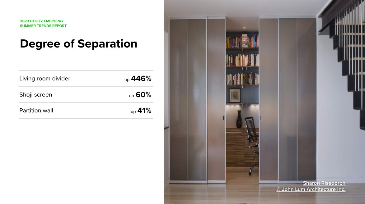 While open-concept design may be popular in the kitchen, we’re seeing increased interest in design elements that create temporary separation, such as a “living room divider,” “Shoji screen” and “partition wall” (up 445%, 60% and 41%, respectively).