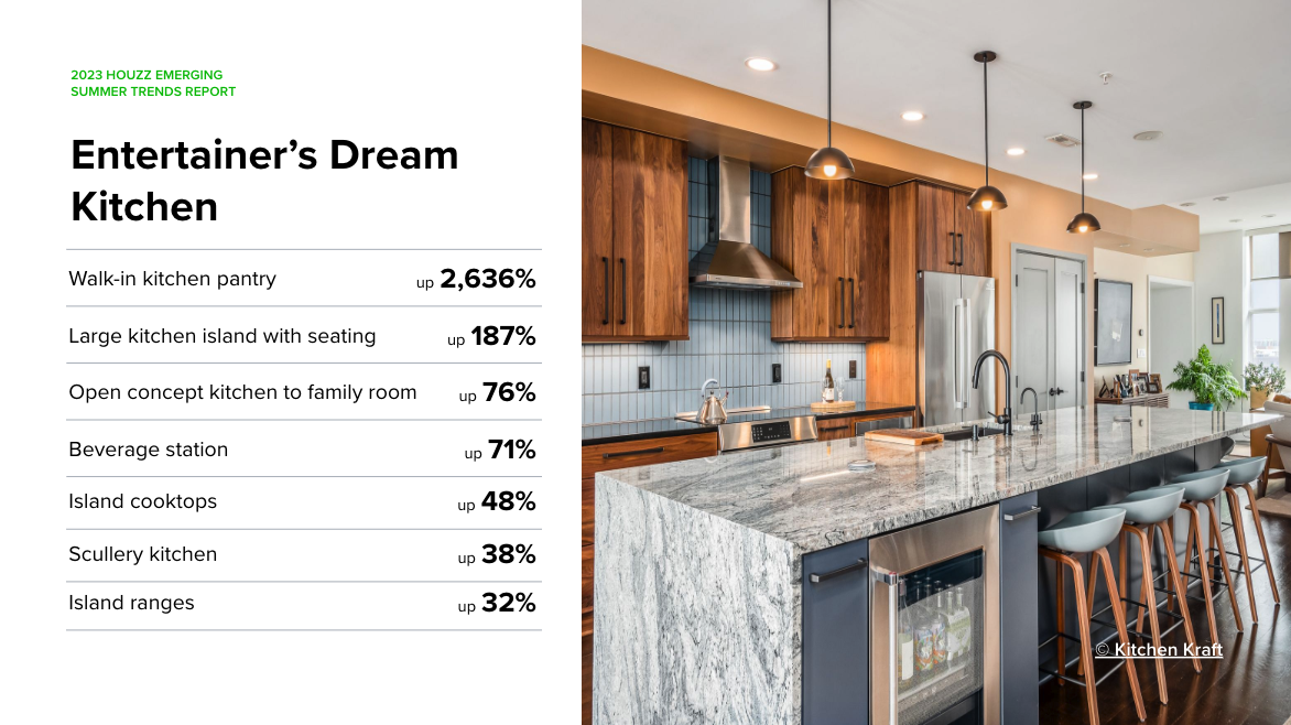 The 2023 U.S. Houzz Kitchen Trends Study found that nearly 3 in 5 homeowners use their kitchen for entertaining following a renovation (57%). That motivation seems to be influencing everything from layout to storage. Searches for “open concept kitchen to family room” grew 76% and island cooktops and ranges also increased in popularity, enabling cooks to face and engage with their guests as they prepare a meal. “Walk-in kitchen pantry”, which offers additional storage to have enough supplies on hand for a large group and hide away smaller appliances such as toasters and coffee makers, jumped 27x compared with the same period in 2022. Searches for “Scullery kitchen,” which provides a room for cleaning and doing messy kitchen work away from your guests, grew 38%.