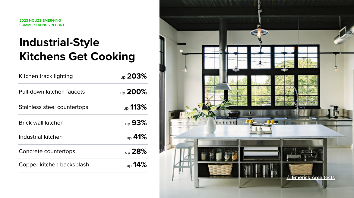 Industrial-style kitchens appeal to many cooks, with their commercial vibe, easy-to-clean surfaces and high-traffic durability. Perhaps that’s why we’re seeing added interest in “Industrial kitchens” and associated features, with searches tripling for “kitchen track lighting” and “pull-down kitchen faucets” and doubling for “stainless steel countertops” and “brick kitchen wall.” Interest is also emerging for “concrete countertops” and “copper kitchen backsplash.”
