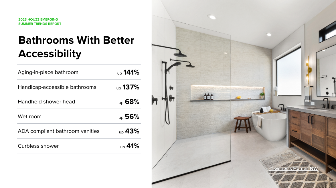 The 2023 U.S. Houzz & Home Study showed that homeowners increasingly renovate their space for the long run. They’re also making improvements to bathrooms that allow them to safely remain in their homes into retirement years. Searches for “aging-in-place bathrooms” and “handicap-accessible bathrooms” each more than doubled compared to the same period in 2022. Features like “handheld shower head,” “ADA compliant bathroom vanities” and “curbless showers” all grew in prominence, as well.