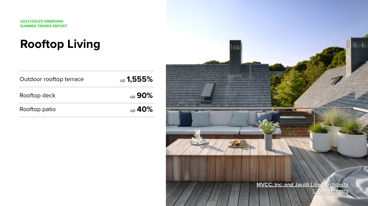 People are increasingly utilizing their rooftops to expand livable space as well, particularly in metropolitan areas where outdoor space is a hot commodity. Searches for “outdoor rooftop terrace” shot up 16.5x. “Rooftop deck” and “rooftop patio” grew by 90% and 40%, respectively.