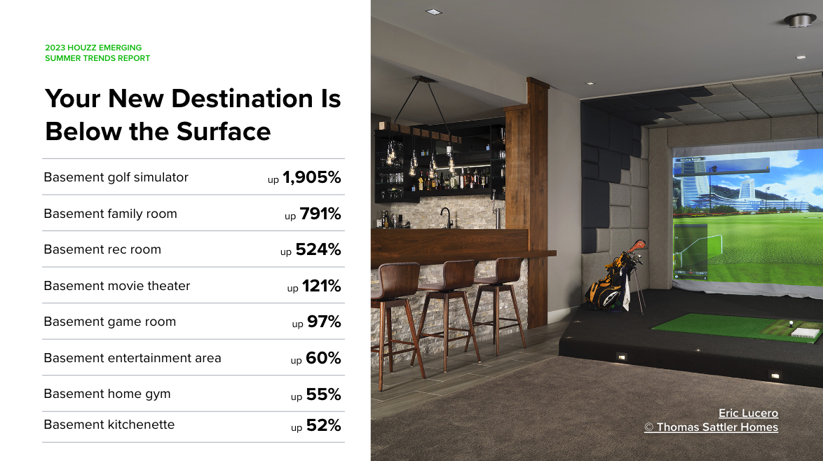 We’re seeing a focus on creating more functional use for previously underutilized areas of the home. Finishing a basement creates a large open space that can be used as a family or recreation room (with searches up nearly 9x and 6x, respectively), making a destination for watching movies, playing games and exercising. In fact, searches for “basement golf simulator” spiked an astounding 20x!