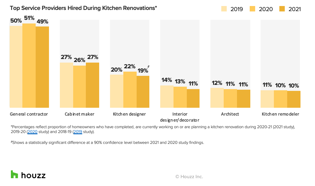 Structural changes often require the help of a professional and more than four in five homeowners confirmed that they hired or plan to hire a pro (85%), with general contractors being the top choice (49%). Fewer than one in five homeowners hire a specialty service provider without a project manager (18%).