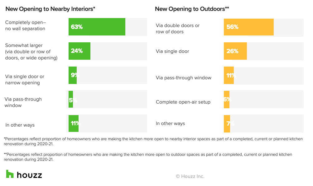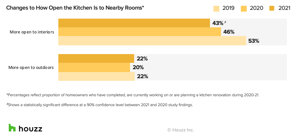 Kitchens are often referred to as the heart of the home, and their relation to other rooms and outdoor spaces are a consideration during renovations. The number of homeowners creating an open-concept floor plan by opening up their kitchen to other interior spaces has dropped dramatically in the past three years (43% in 2021 versus 53% in 2019). One in five homeowners opens the kitchen to outdoor spaces (22%), consistent with increased demand for outdoor home professionals on Houzz.++