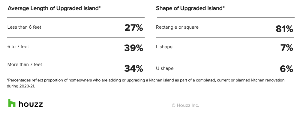Nearly two-thirds of renovated kitchens feature an island (63%). The majority of upgraded and new islands are seven feet or less in length (66%), though one-third of islands are quite large, exceeding seven feet in length (34%). Rectangular or square islands are most common (81%), with only 7% and 6% choosing an L or U shape, respectively.