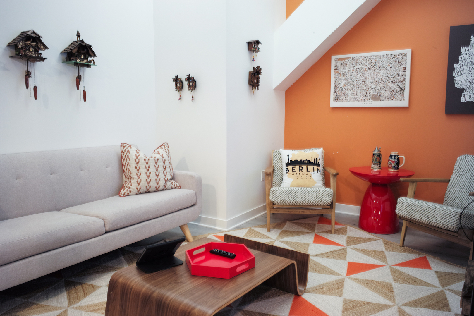The German Den features an impressive collection of cuckoo clocks, a map of Berlin and a fun burst of color. This room serves as a comfortable lounge space for team members to connect.