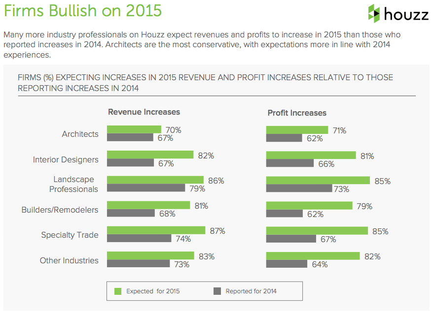 – Looking forward to 2015, firms in the Houzz community continue to be bullish about their expectations for 2015. Many more firms expect revenues and profits to increase in 2015 than those reporting increases in 2014. The expected rates of growth continue to be in the high single to healthy double-digits in 2015, with an observed shift toward more moderate growth expectations than in 2014.