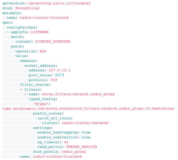 The above configuration creates a Redis proxy frontend on 127.0.10.1:6379. This address is available to the other containers aside from istio-proxy. The most important config, is prefix_routes.catch_all_route to redis-cluster-backend cluster which is the exact backend cluster we created before. The config of a proxy frontend is relatively simple, with fewer settings that can be tuned. One important setting is read_policy. Chose PREFER_REPLICA to achieve the functional parity as the original PHP Redis cluster client’s logic. When reading from Redis (get, mget, etc.), always read from replica nodes. Only read from primary nodes when all replica nodes for the slots are not available.
