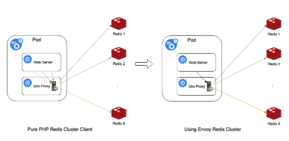 After using the Envoy Redis cluster proxy, the PHP client only needs to connect to the frontend proxy in an istio-proxy container, and Envoy will “smartly” dispatch the commands to a proxy backend, and create connections to X Redis cluster servers.