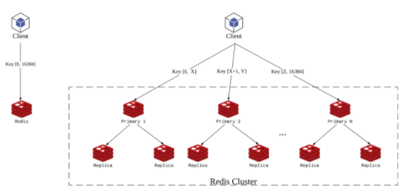 Redis scales from one instance to multiple instances by relying on the KEY hashing. As a key value storage system, Redis cluster tries to distribute all KEYs into different instances based on the cyclic redundancy check (CRC) hash of the KEY. Each instance in the Redis cluster only stores KEYs within its own slot ranges, and all instances in the Redis cluster cover the whole range of CRC hash, which is [0, 16384].